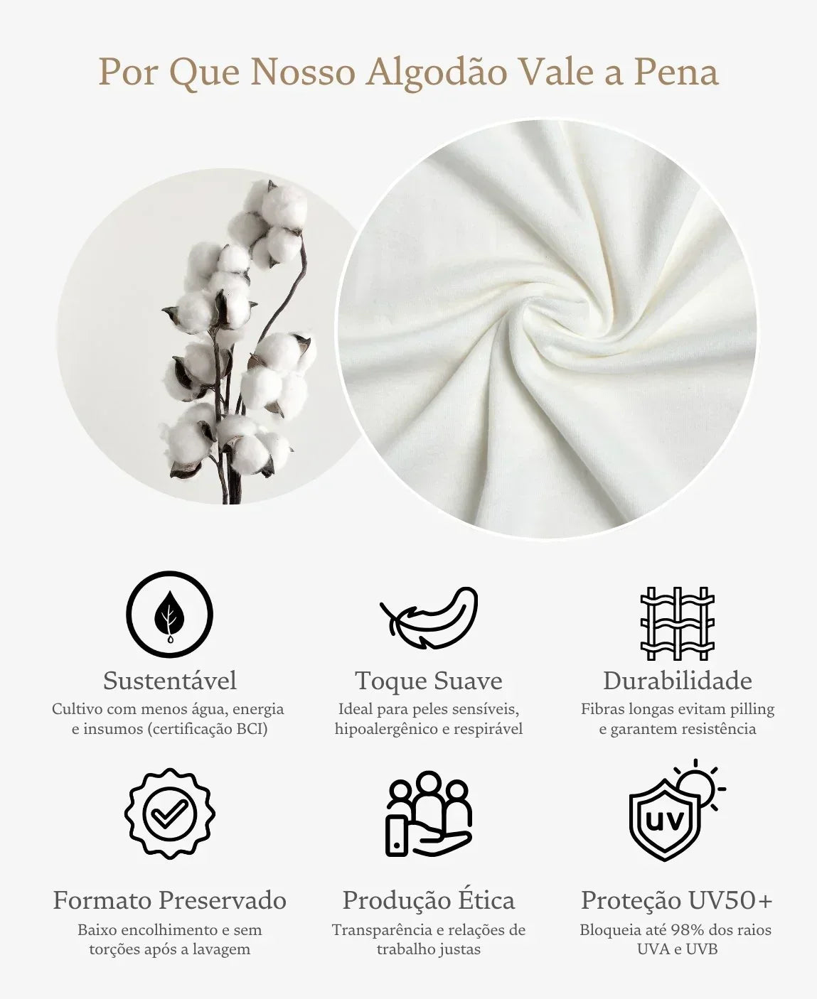 - Tecnologia: Algodão 100% sustentável, Algodão Certificado ECO3, Proteçao UV50+, Tecnologia Anti-Pilling, Acabamento Ultrasoft, Fios de Algodão Egípcio, Tingimento Resistente
