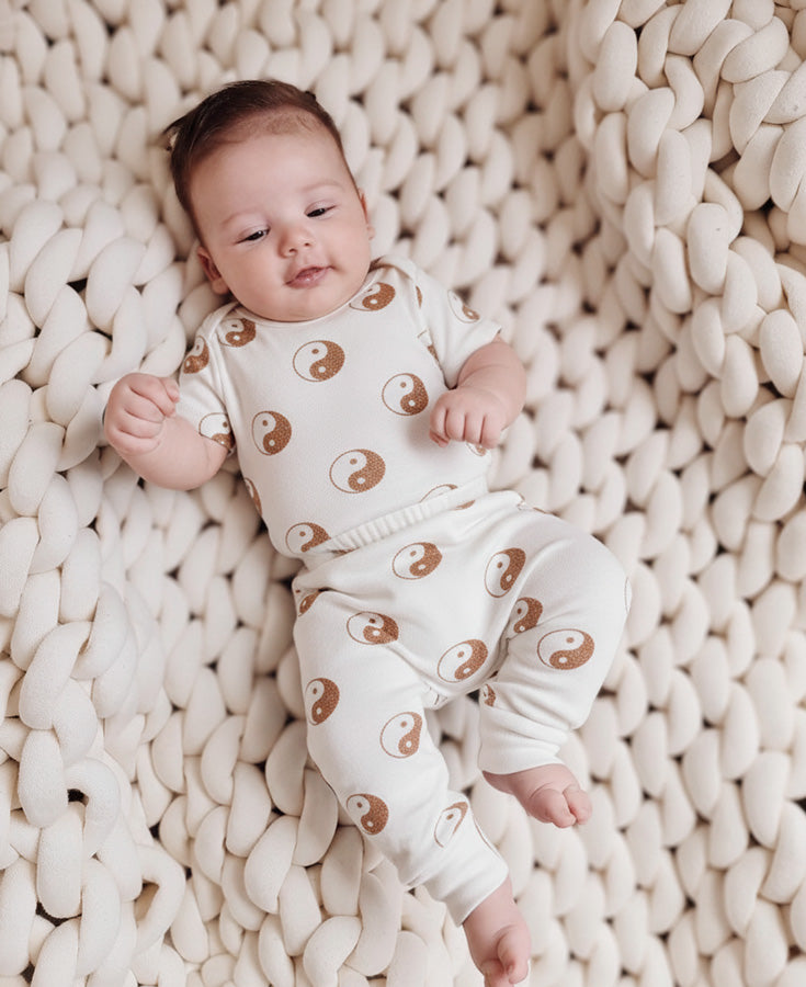 A estampa Yin Yang traz o símbolo universal do equilíbrio entre opostos: luz e sombra, energia e calma, ação e descanso — tudo o que o início da vida representa.