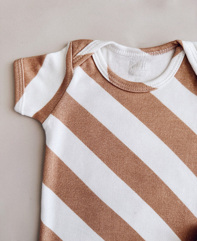 Conjunto Body Manga Curta e Calça Bebê Unissex | Listras Diagonais Bege – Conforto, Estilo e Minimalismo para os Primeiros Meses