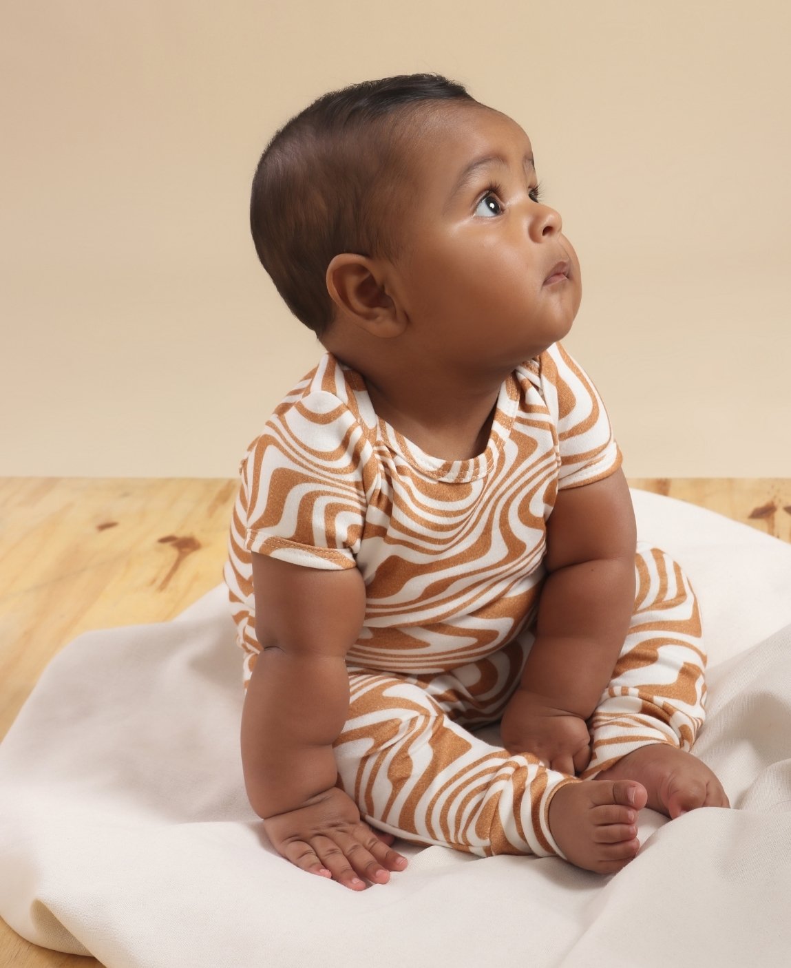 Fabricado em malha de algodão premium, o tecido é macio, respirável e gentil com a pele sensível do bebê, garantindo o toque suave que toda mãe procura. A estampa de listras diagonais em tom bege traz um visual moderno e atemporal, unissex e neutro, combinando com qualquer estação e ocasião.