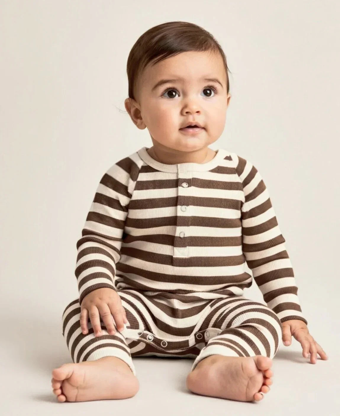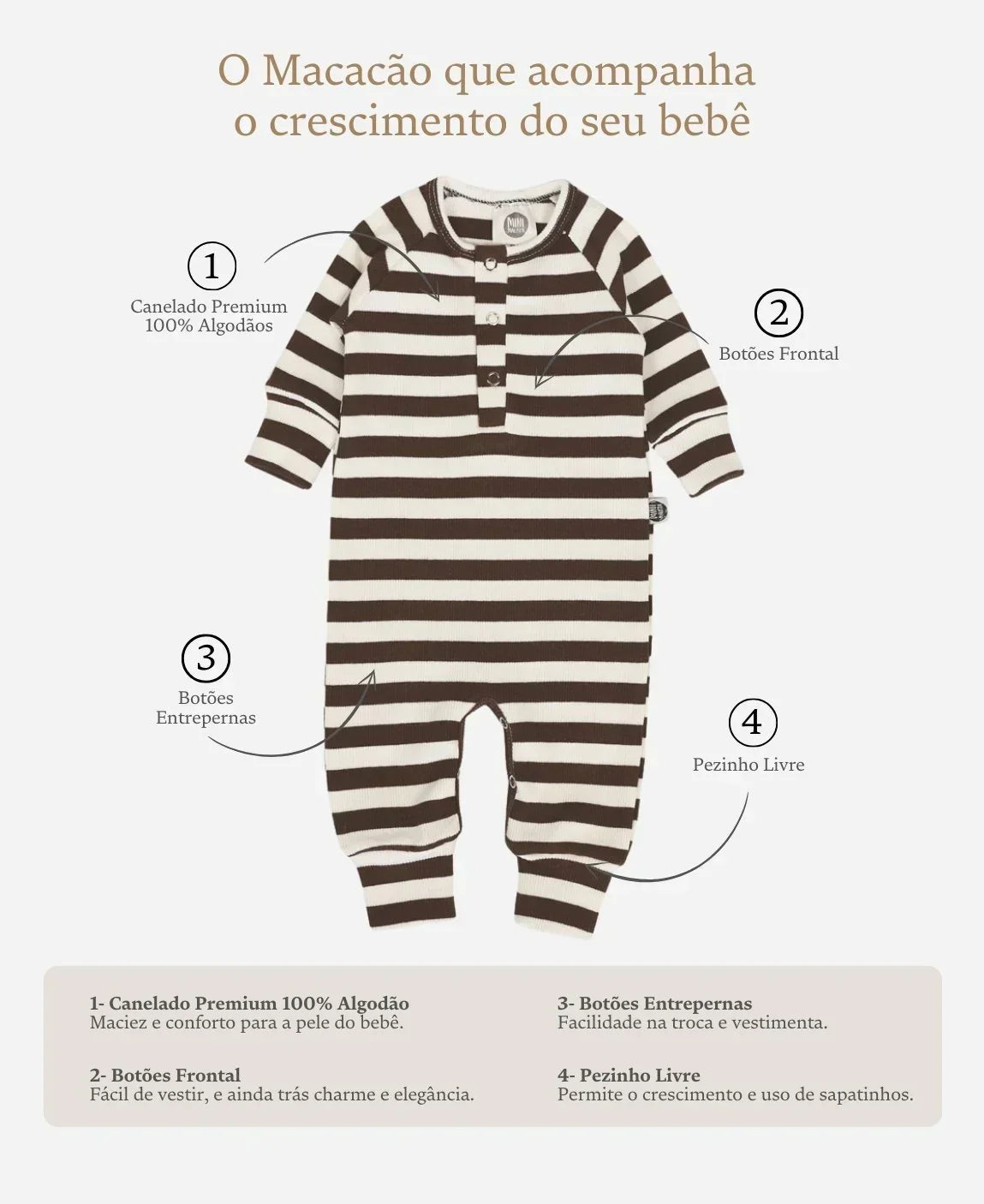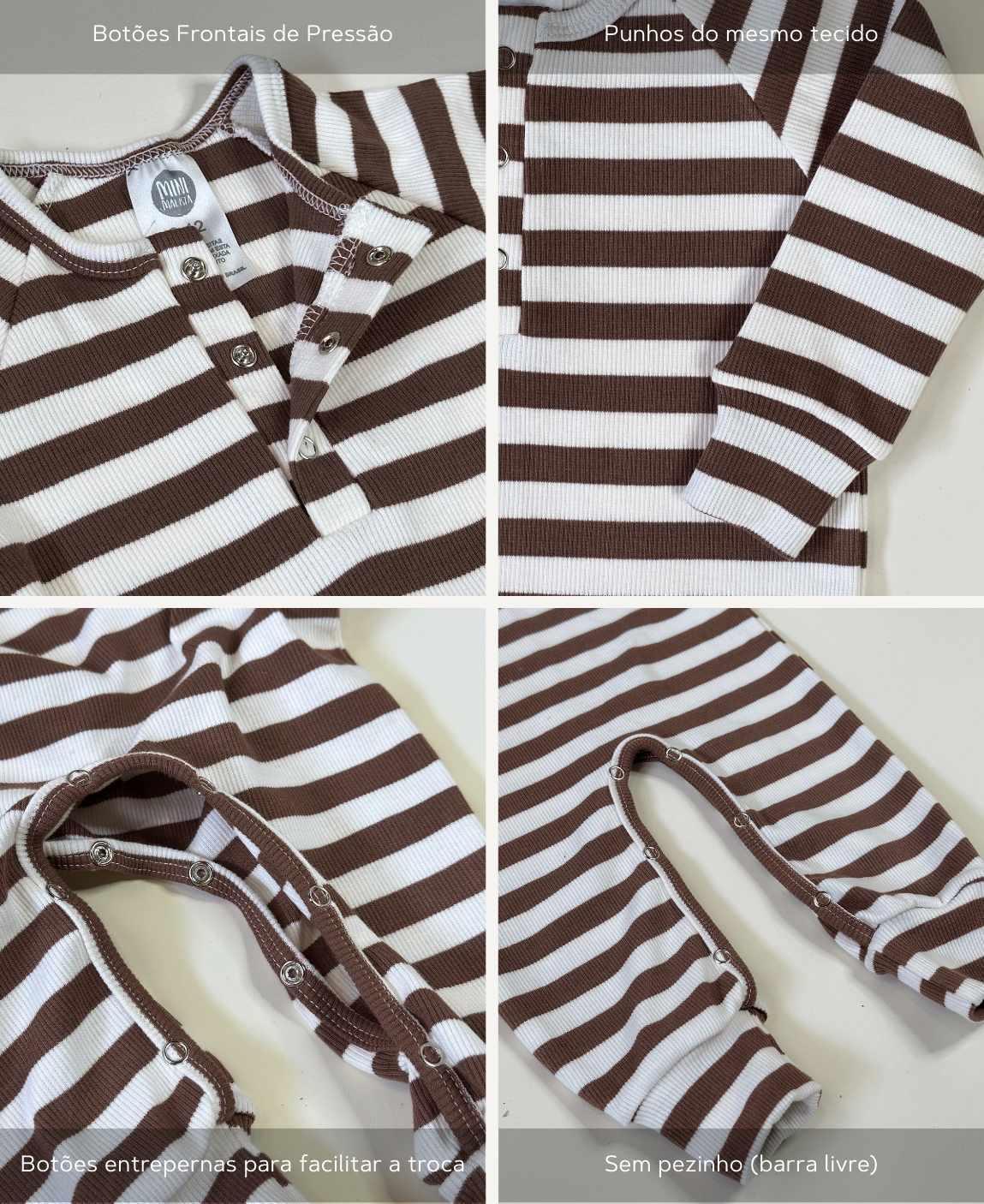Macacão Bebê Canelado Botões Unissex | Listras Marrom e Branco Off