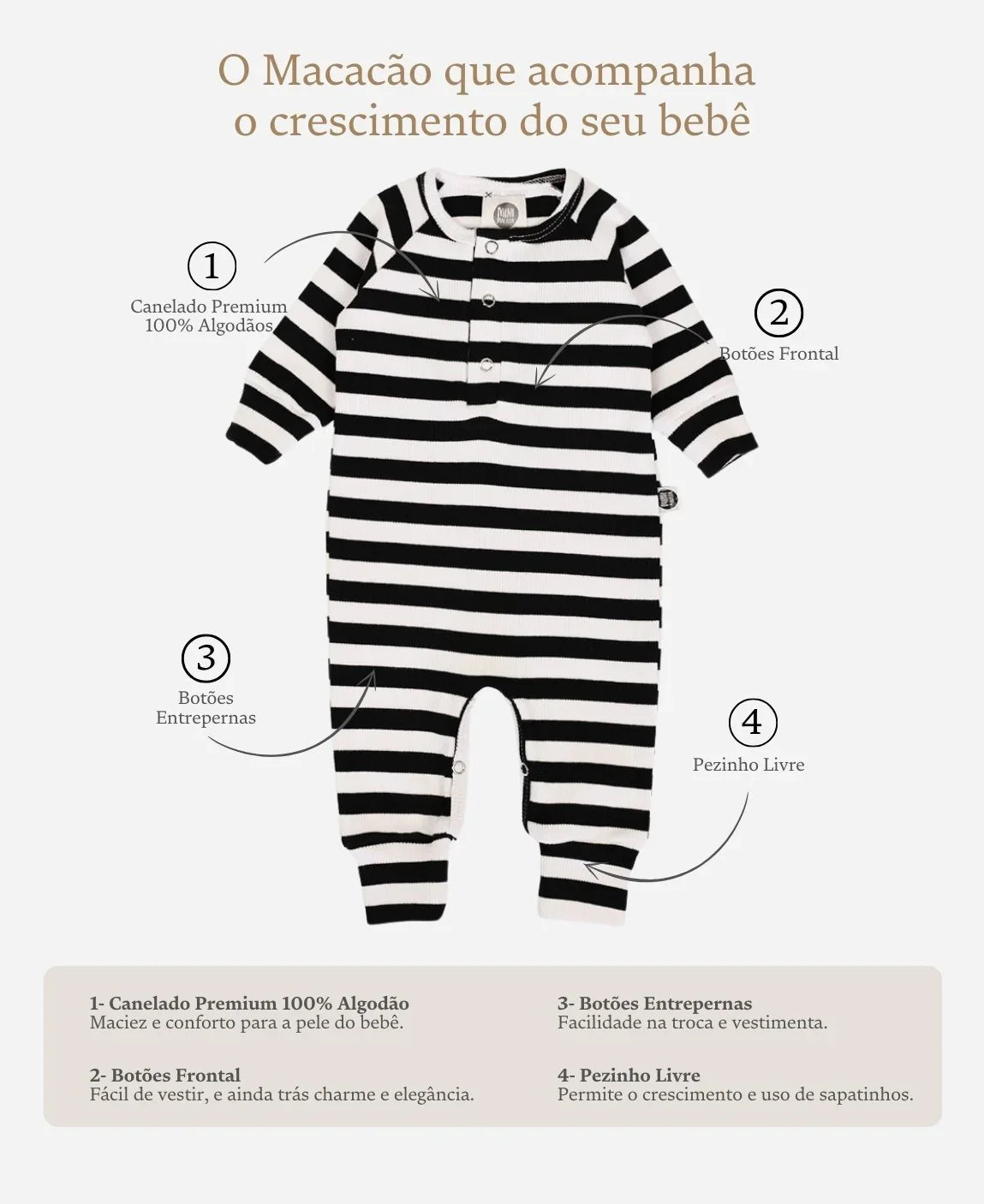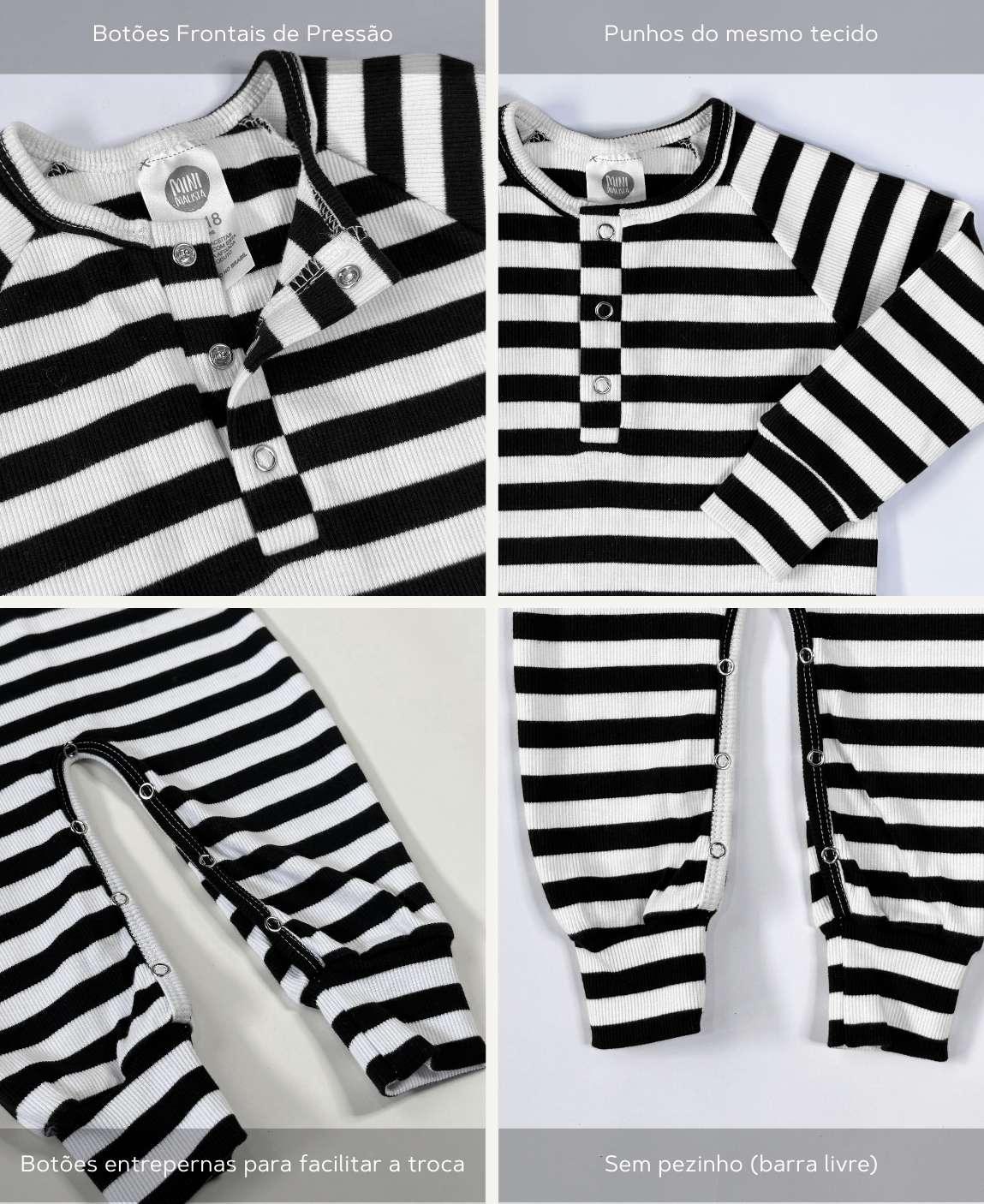 Macacão Bebê Canelado Botões Unissex | Listras Preto e Branco