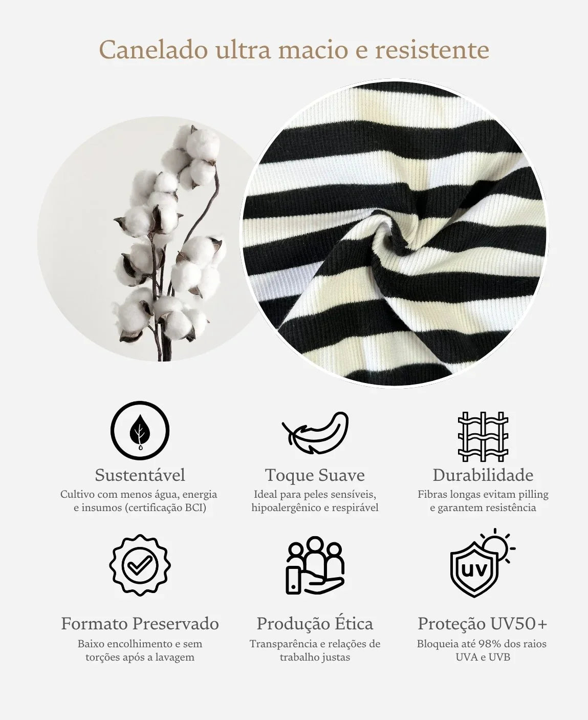 As peças caneladas da MiniMalista são confeccionadas em malha premium de ribana, composta por 94% algodão e 6% elastano, proporcionando conforto, elasticidade e um ajuste perfeito. Para garantir a durabilidade e manter o tecido impecável, siga as instruções abaixo:
