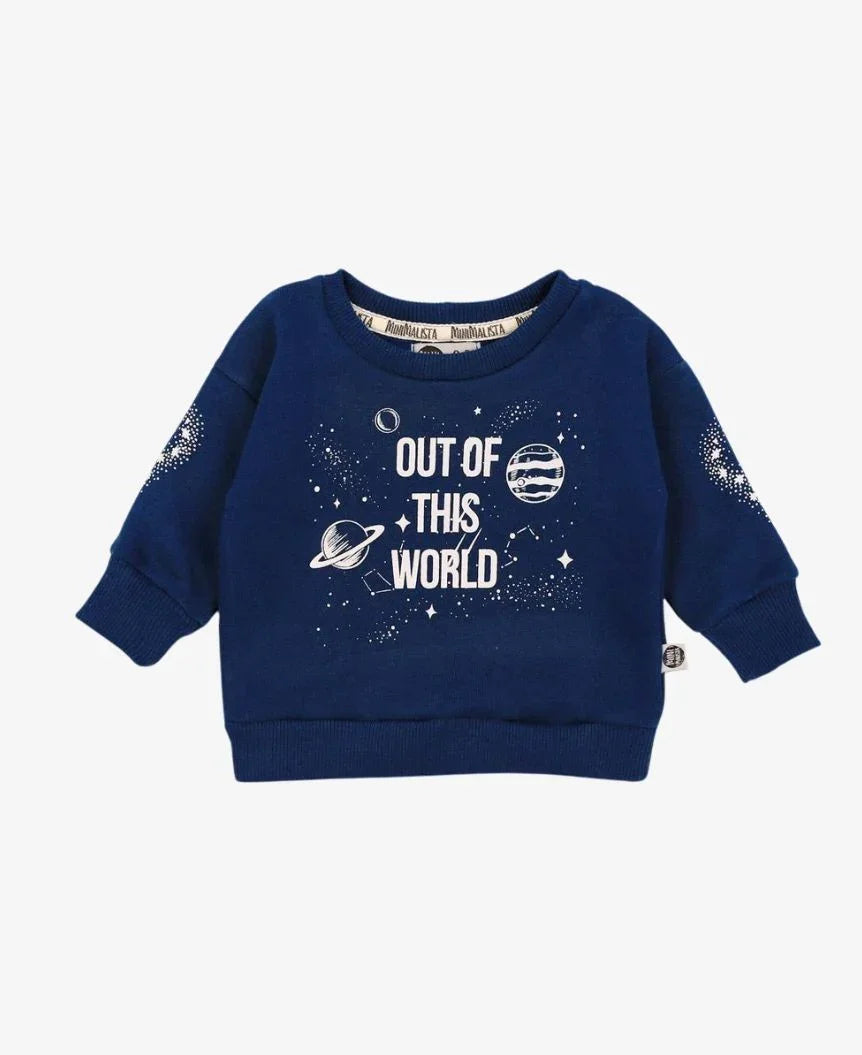 O Moletom Básico Peluciado Unissex | Out Of This World é perfeito para pequenos aventureiros que amam explorar o universo, tanto na imaginação quanto no estilo. Com fundo Azul Sky (um azul profundo e vibrante) e uma estampa localizada frontal "Out Of This World" em branco com detalhes inspirados no universo, essa peça une design minimalista e lúdico em perfeita harmonia.