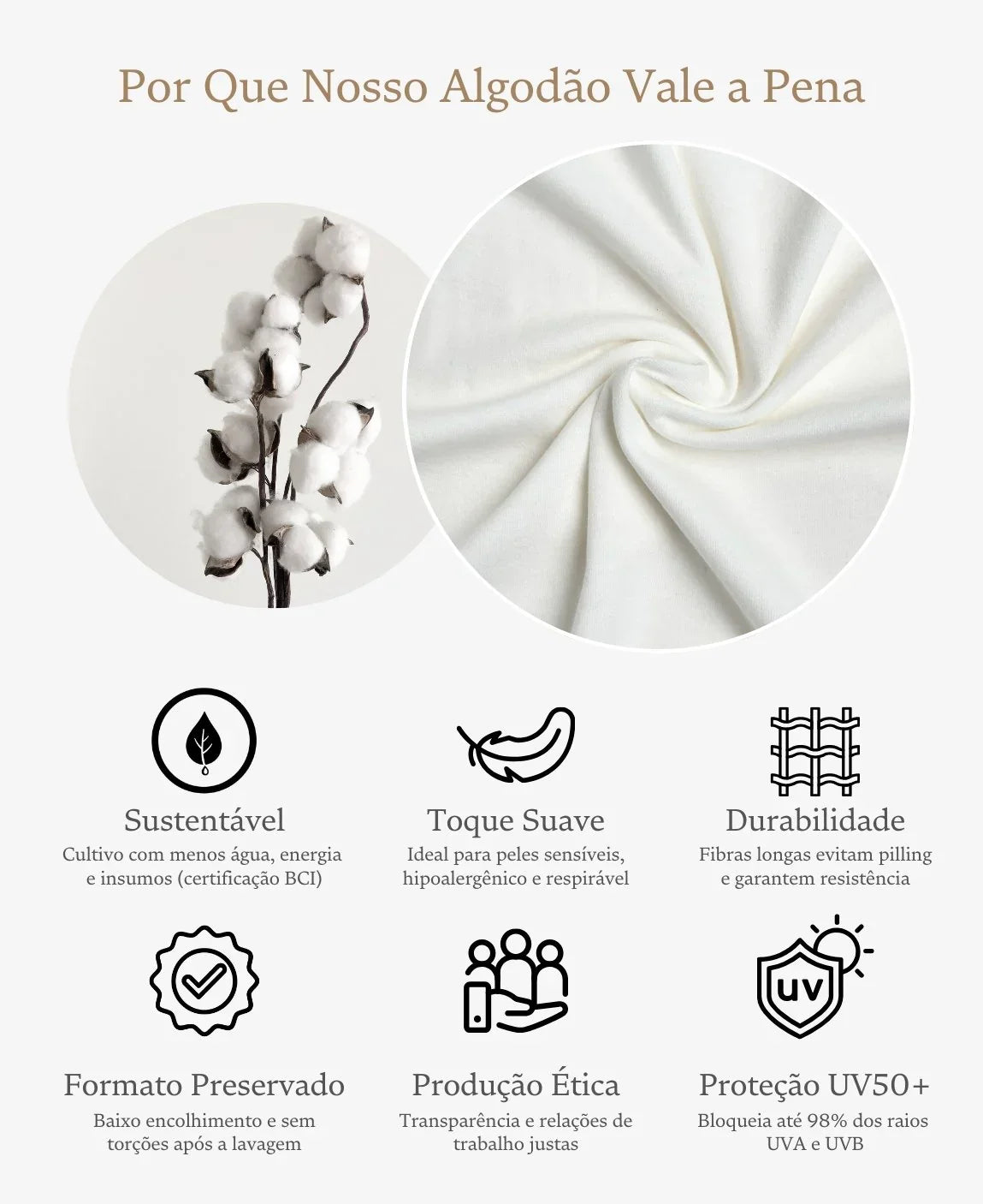 - Tecnologia: Algodão 100% sustentável, Algodão Certificado ECO3, Proteçao UV50+, Tecnologia Anti-Pilling, Acabamento Ultrasoft, Fios de Algodão Egípcio, Tingimento Resistente
